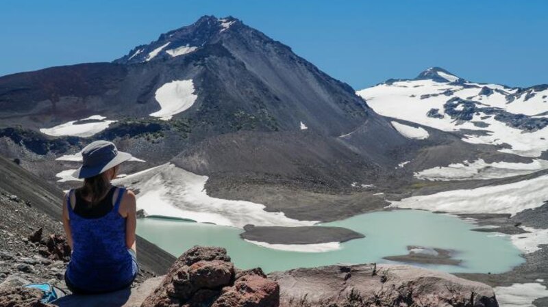 We have hiked in the Three Sisters Wilderness many times and have always enjoyed our experience. However, accessing views of Collier Glacier can be a bit of a challenge. Located in the saddle between North and Middle Sister, Collier Glacier views, on the north edge of Collier Cone, are obtained after a seven and a half mile hike from Lava Camp Lake Trailhead through Matthieu Lakes or the Obsidian Trailhead. While only 1/2 mile off the Pacific Crest Trail, to reach the edge of Collier Cone involves a scramble up a steep pumice hill, but once you arrive, the setting is spectacular with the glacial lake and towering vistas of North and Middle Sister and Little Brother. We hiked this trail 7-15-23 during one of the hottest days of the year. Although we started the hike early, it took almost 8 hours to complete it and much of the trail was exposed to the sun in lava fields or burned forest. However, there were beautiful shaded areas near Matthieu Lakes and our experience was wonderful. We brought a lot of water and enjoyed refilling a water container at Minnie Scott Spring where water can be seen percolating through the small stones. The total hike was over 15 miles and over 2500 feet of elevation gain.