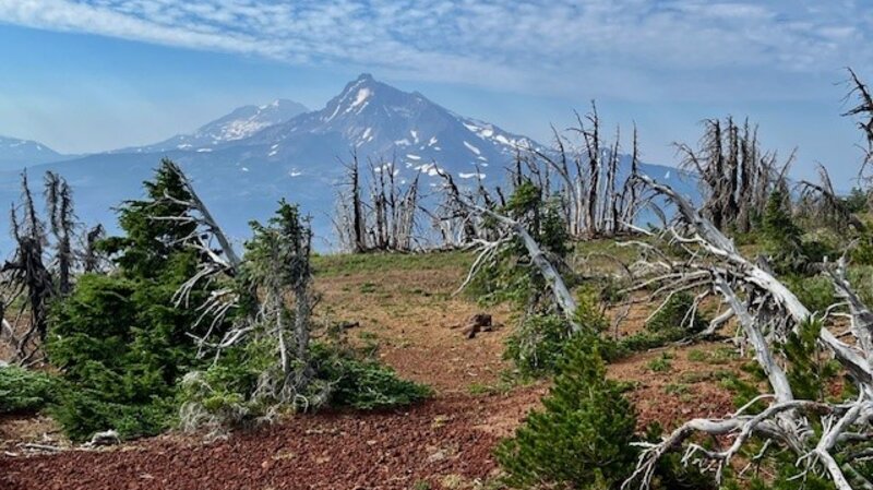 For those wanting a relatively short hike which provides for a lot of elevation gain, Black Crater is one of the best. Located off McKenzie Hwy 242, the hike is limited to the summer season when McKenzie Hwy opens each year. Unfortunately, the 2017 Milli fire burned a lot of the forest on McKenzie Hwy, and the lower slopes of Black Crater were impacted. In the seven years since the Milli fire, manzanita, certain grasses, some wildflowers, and young trees have begun to grow in the dead landscape, but it will take decades until the cinder cone is entirely forested again. The one advantage of the burned forest is the views toward Mt. Washington are far more visible in the lower elevations than they would have been eight years ago.