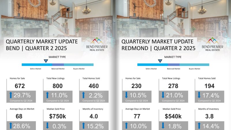Click Here to see the Q2 Market Trends for Bend Real Estate and Redmond Real Estate, as well as the Q2 real estate trends in Sunriver, La Pine, Sisters, Prineville, Madras, Powell Butte, and Black Butte Ranch. In Q2 2025, the Bend Oregon Real Estate market and surrounding communities experienced a change, typically seeing a significant increase in inventory year over year with more homes, more new listings, and consistently more days on market. Buyers had more choices with the increased number of homes for sale and sellers were more inclined to consider offers under asking price. The number of listings grew, days on market increased in many markets, and prices decreased slightly in the larger markets of Bend and Redmond. However, despite the increased number of homes for sale, Bend, Redmond, Sisters, Prineville and Madras reflected a seller's market, although much less strong than in earlier quarters; Black Butte Ranch, La Pine and Sunriver were in a balanced market with Powell Butte in a very strong buyer's market with 32 months of supply.