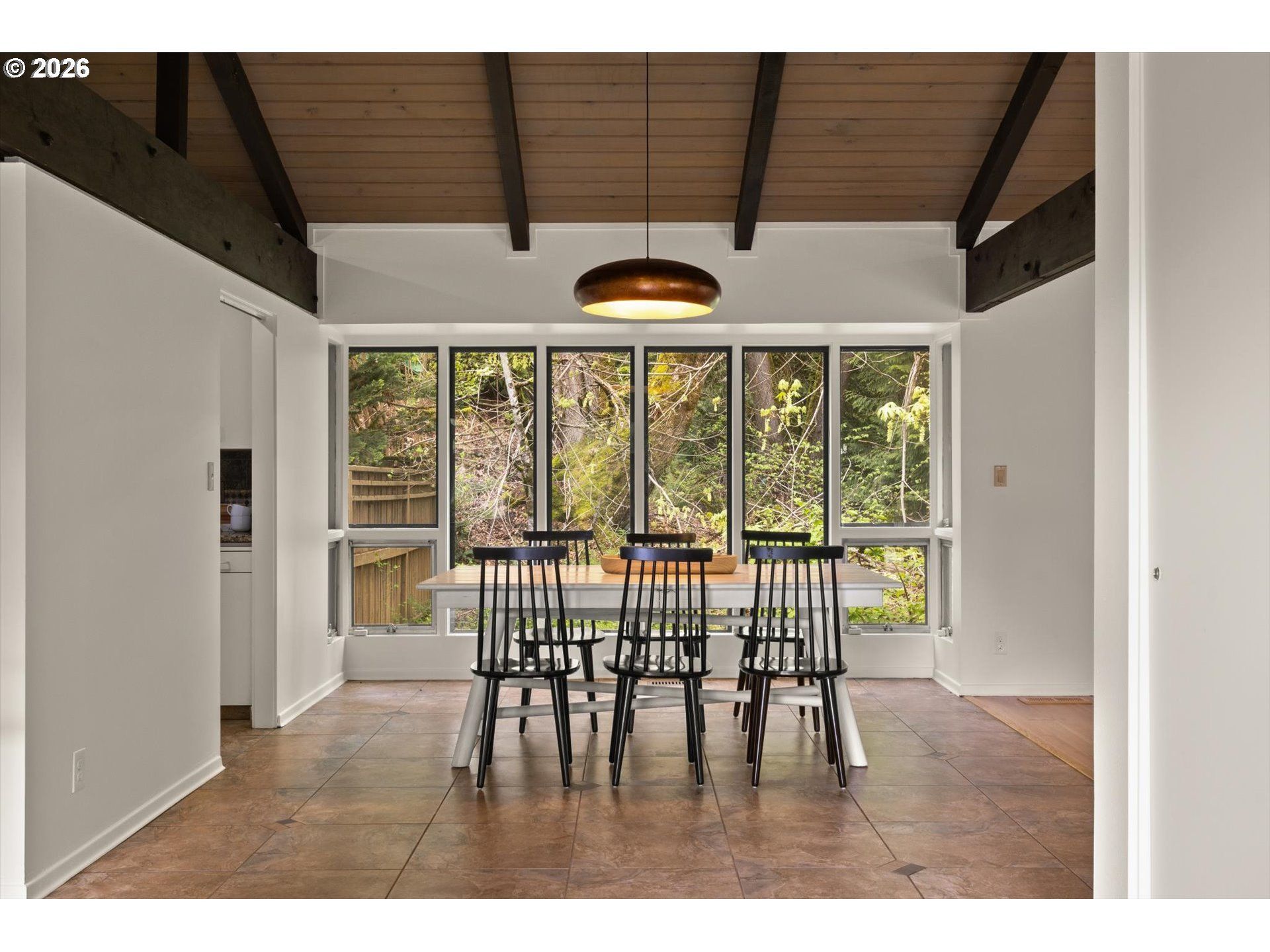 Mid-century retreat in prestigious Forest Highlands neighborhood. Tucked into a serene, tree-lined enclave just moments from Tryon Creek State Park, this 1962-built home offers the rare combination of architectural character, natural beauty, and meaningful system upgrades-creating an ideal canvas for your personal vision. Inside, classic mid-century design elements take center stage: soaring vaulted ceilings, exposed beams, and warm tongue-and-groove detailing that bring volume, texture, and timeless style. With 5 bedrooms, 3 full baths, and 4,146 square feet, the floor plan offers flexibility for a variety of living arrangements, creative spaces, or multi-generational needs. The heavy lifting has already been done. A meticulously maintained concrete tile roof, updated HVAC and water heater, electrical improvements, whole-house generator, updated water main, repaired sewer line, and refreshed front deck framing provide peace of mind-freeing you to focus on the design and style of the home. Separate exterior entrance to the lower level opens the door to a distinct living area-well-suited for multi-generational living, guest quarters, or flexible use depending on your needs. Wooded exteriors surrounding a calming back yard with apple, fig, pear and plum trees as well as producing blueberry bushes. Backing to protected greenspace within the Tryon Creek watershed, the property offers a tranquil, almost meditative connection to nature-yet remains just minutes from trailheads, bustling First Addition Lake Oswego, and top-rated Forest Hills Elementary School. Surrounded by luxury homes in one of the area's most sought after neighborhoods, this is a rare opportunity to bring your vision to life in a setting that supports it. A compelling blend of location, architecture, and investment opportunity - ready for its next chapter.